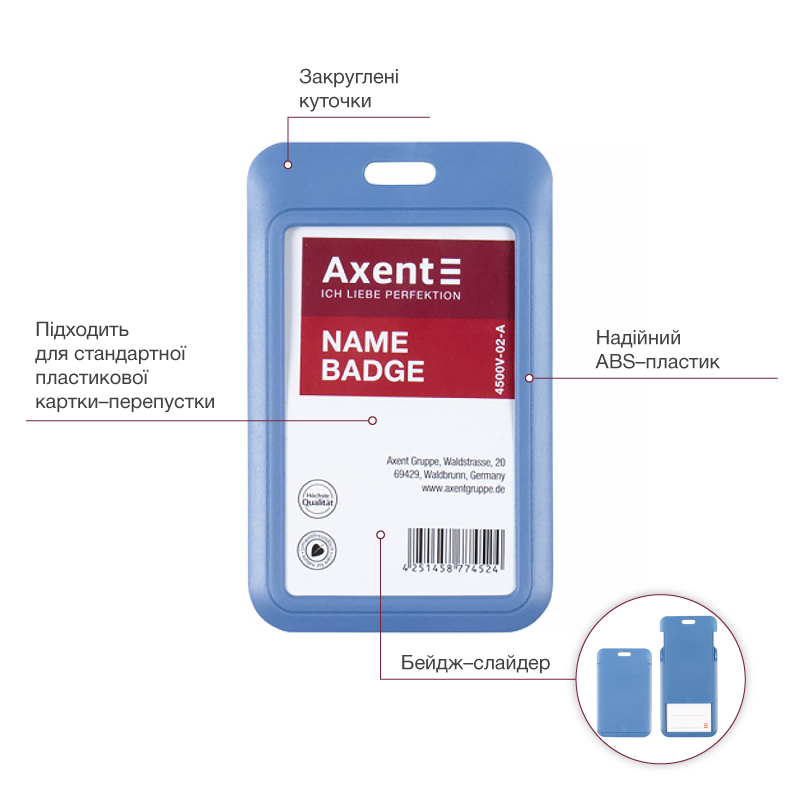 Бейдж-слайдер 4500V вертикальний 69х110мм, внутрішній розмір 54х85мм, димчасто-синій AXENT