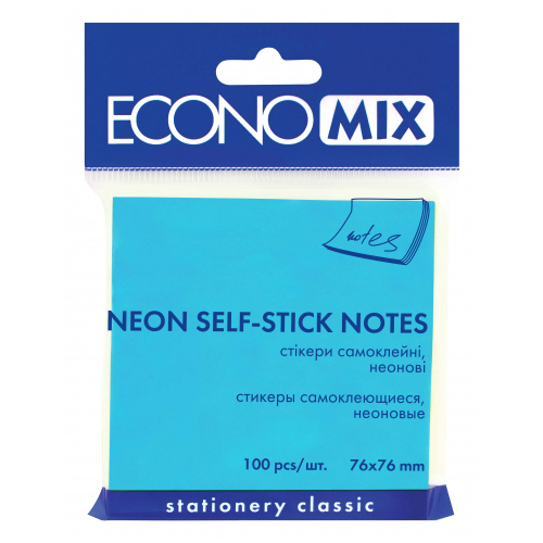 Блок паперу з клейким шаром 75х75мм, 100 арк. неон, блакитний, ECONOMIX