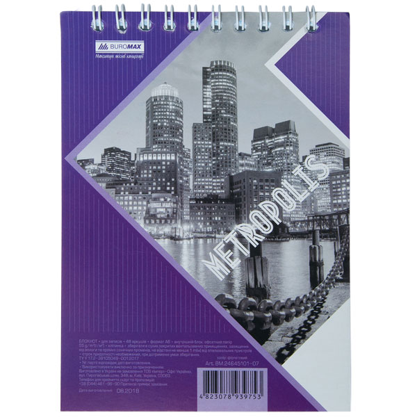 Блокнот А6, 48 арк, клітинка, офсет, спіраль зверху, картонна обкладинка, колір фіолетовий, METROPOLIS BUROMAX