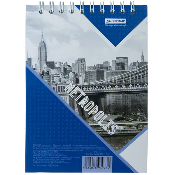 Блокнот А6, 48 арк, клітинка, офсет, спіраль зверху, картонна обкладинка, колір синій, METROPOLIS BUROMAX