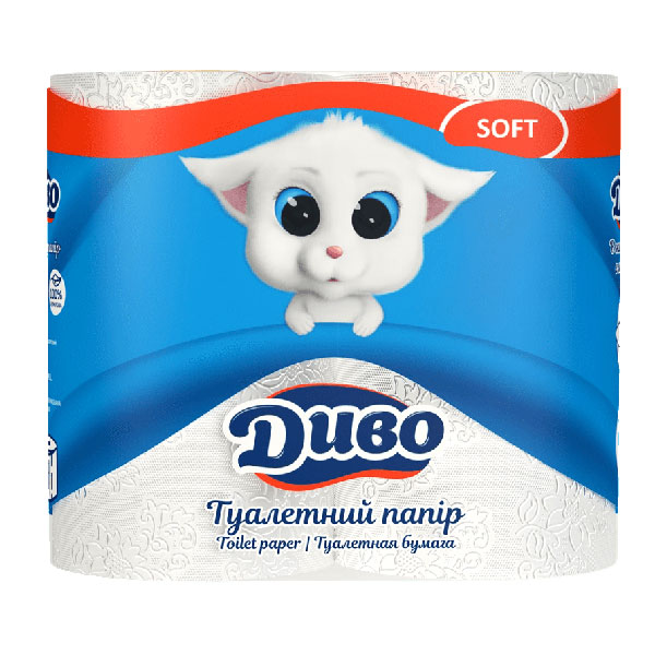 Папір туалетний рулонний 2-шаровий, целюлозний, 4 шт, білий, ДИВО