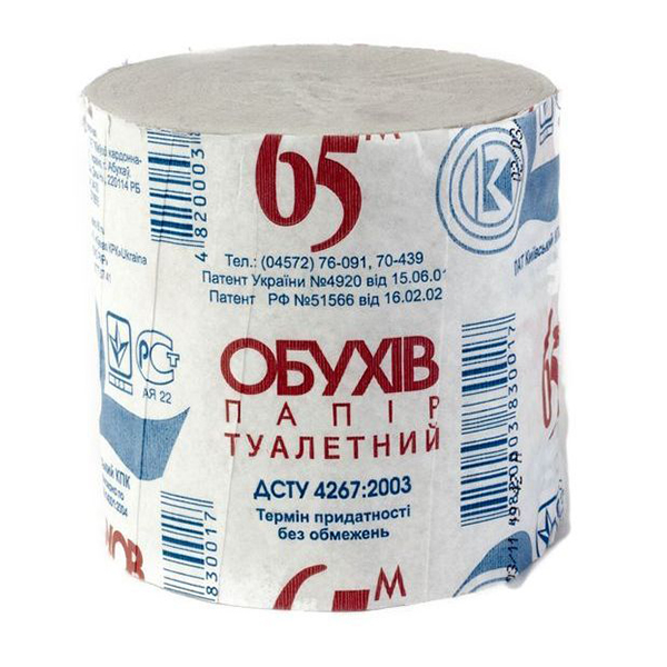 Папір туалетний рулонний 1-шаровий, макулатурний, без гільзи, 65 м, ОБУХІВ