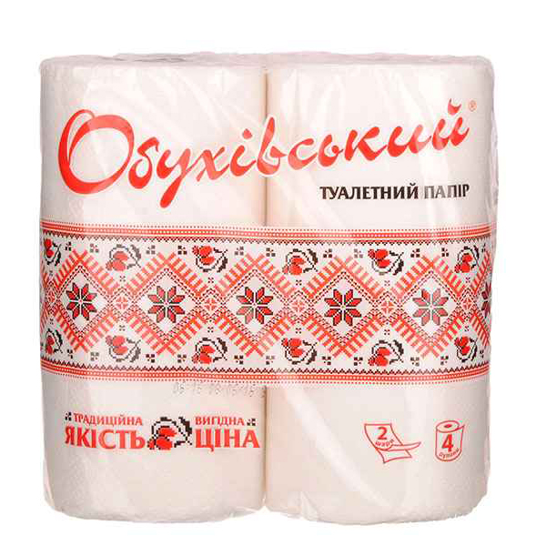 Папір туалетний рулонний на гільзі 2-шаровий, Обухівський, 4 шт, білий, ОБУХІВ