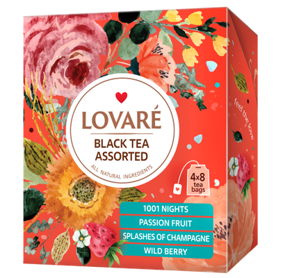 Чай чорний пакетований асорті, 4 види по 8шт, 32шт х2г, LOVARE