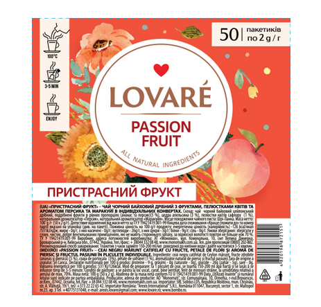 Чай чорний пакетований Пристрасний фрукт, 50шт х2г, LOVARE