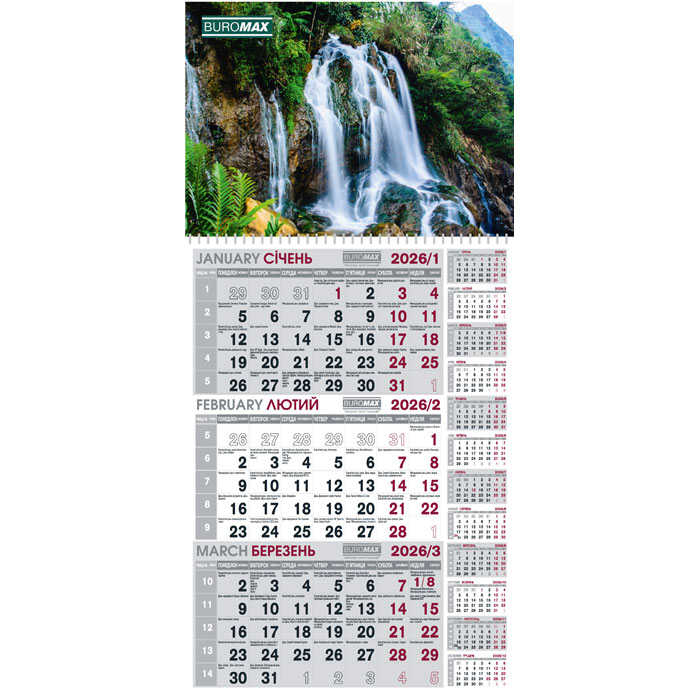 Календар 2026 квартальний на одну пружину, Водоспад, BUROMAX