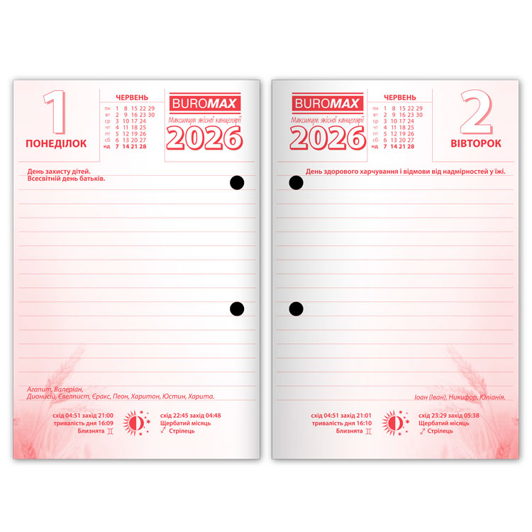 додаткова інформація на кожен день: час сходу та заходу сонця, фаза місяця, іменинники дня, державні, міжнародні, професійні, церковні свята та пам'ятні дати