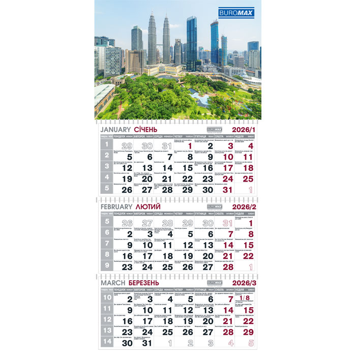 Календар квартальний 2026 рік на три пружини, Місто, BUROMAX