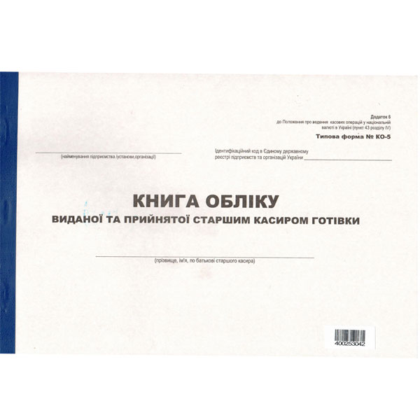 Книга обліку виданої та прийнятої старшим касиром готівки А4 форма №КО-5, 20арк., офсет, горизонтальна, м'яка картонна обкладинка, зразок 2018р.