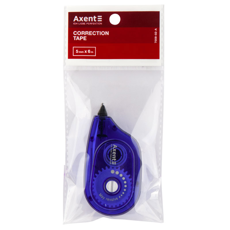 Стрічка коригуюча Axent 7009-02-A. Дозволяє акуратно й точно коригувати текст. Можна одразу ж вносити виправлення поверх відкоригованого текста. Непомітна при копіюванні та передачі факса.