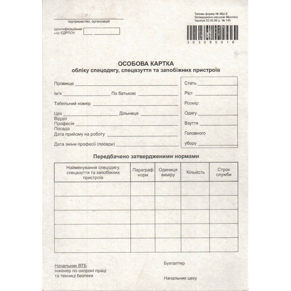 Особиста картка обліку спецодягу, взуття і предохр.пріспособлень А5с/о, хр/ерз МШ-6