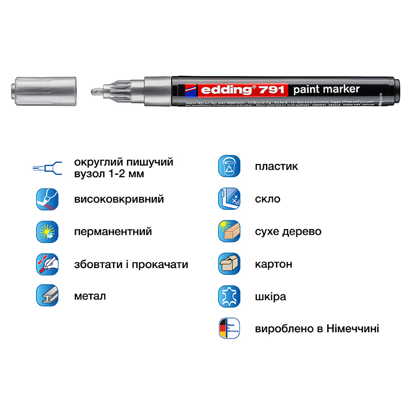 Маркер лак 1-2 мм PAINT, кулеподібний, срібло, Е791 EDDING