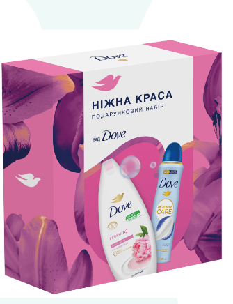 Улюблені продукти бренду Dove в одному наборі: ніжний крем-гель для душу з ароматом півонії та трояндовою олією та дезодорант турботливо доглянуть за вашою шкірою та залишать відчуття легкості та ніжності на весь день.
