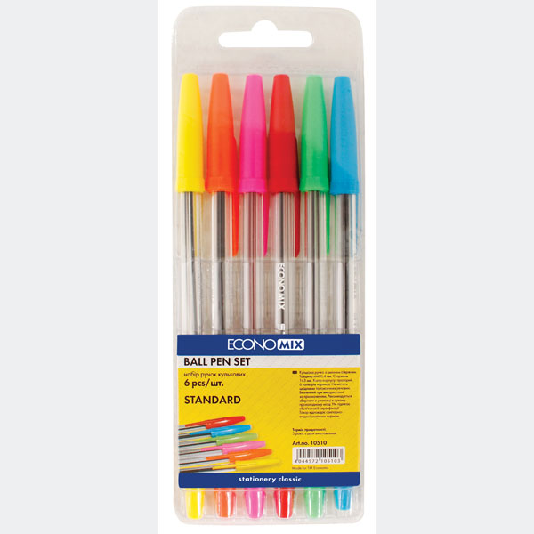 Набір ручок кулькових 0,5 мм STANDART, 6 кол., асорті, ECONOMIX