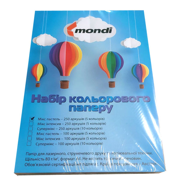 Набір кольорового паперу А4 80 г/м2 250 аркушів пастель (5 кольорів)