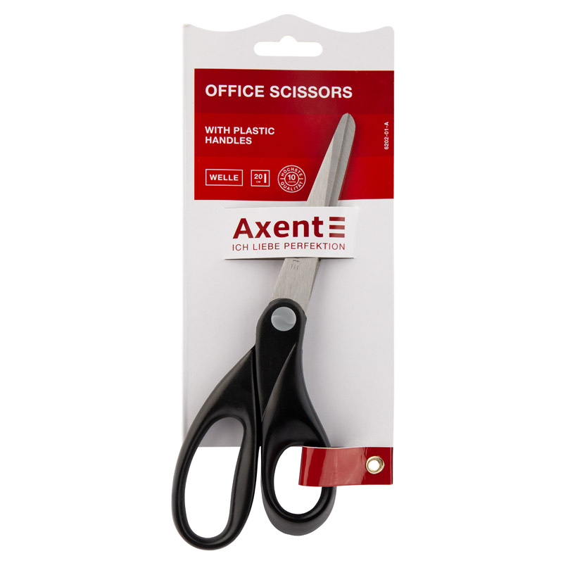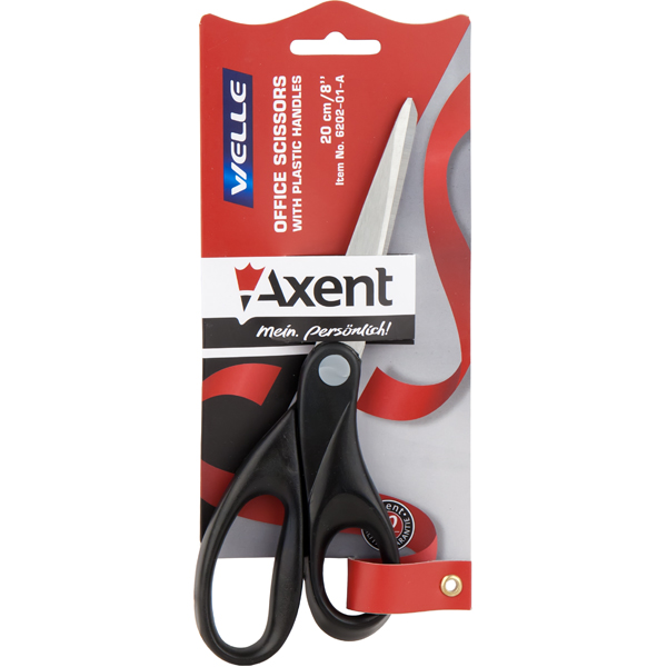 Ножиці канцелярські 20 см, пластикові ручки, Welle, чорні, AXENT