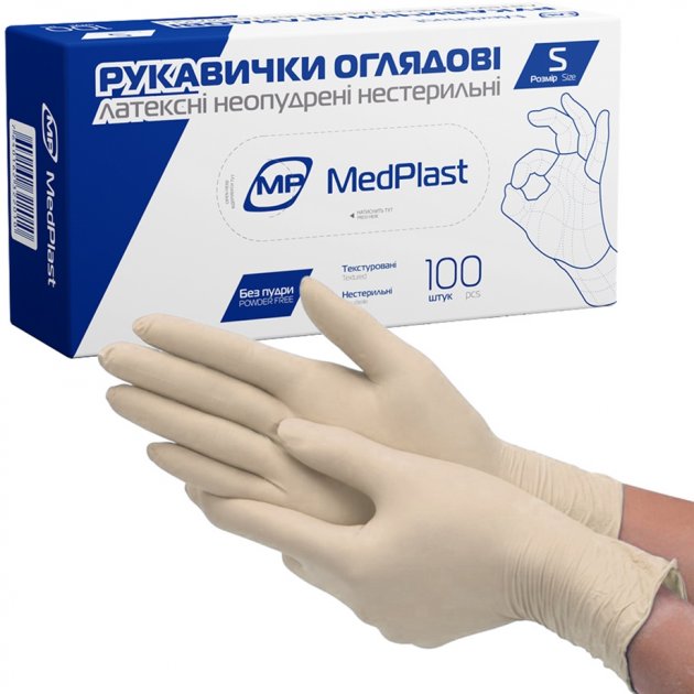 Рукавички латексні оглядові нестерильні неопудрені розмір (S), 100 шт., MedPlast