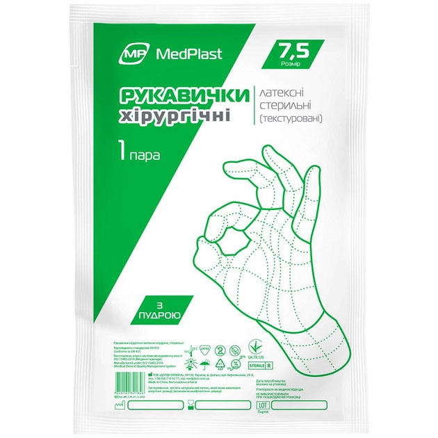 Рукавички латексні стерильні з пудрою, розмір 7,5 (1пара), MedPlast