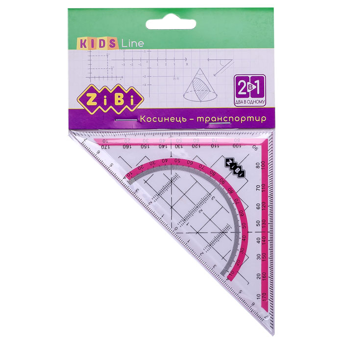 Кутник пластиковий з транспортиром 140мм, 90°/45°,блістерна упак., рожевий, ZiBi