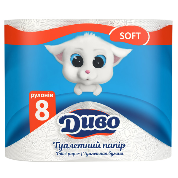 Папір туалетний рулонний 2-шаровий, целюлозний, Soft, 8шт, білий, ДИВО