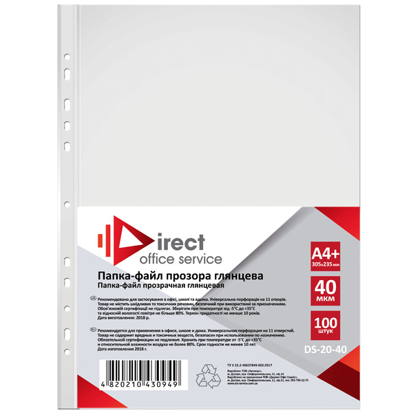 Файли А4, 40мкм, 100шт/пач, DS-20-40, DIRECT OFFICE SERVICE