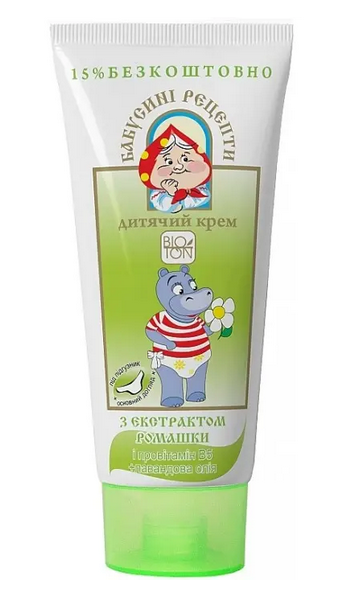Спеціально для догляду за ніжною шкірою малюків, яка піддається роздратуванням внаслідок використання підгузків, експертами українського бренду Bioton Cosmetics створено дитячий крем з екстрактом ромашки та лавандовою олією. Засіб рекомендується хлопчикам та дівчаткам вікової категорії від 3 років. У складі формули крему присутні натуральні інгредієнти: екстракт ромашки, провітамін В5 та лавандова олія. Завдяки такому лікувальному коктейлю крем забезпечує протизапальну, антисептичну, зволожуючу, заспокійливу дію. Bioton Cosmetics Body Cream досить швидко знімає запалення та роздратування, заспокоює та загоює шкіру, усуває сухість та лущення, надійно захищає ніжну шкіру від утворення попрілостей під час використання підгузків. Консистенція крему добре вбирається, а її приємний аромат неодмінно сподобається малюкам.