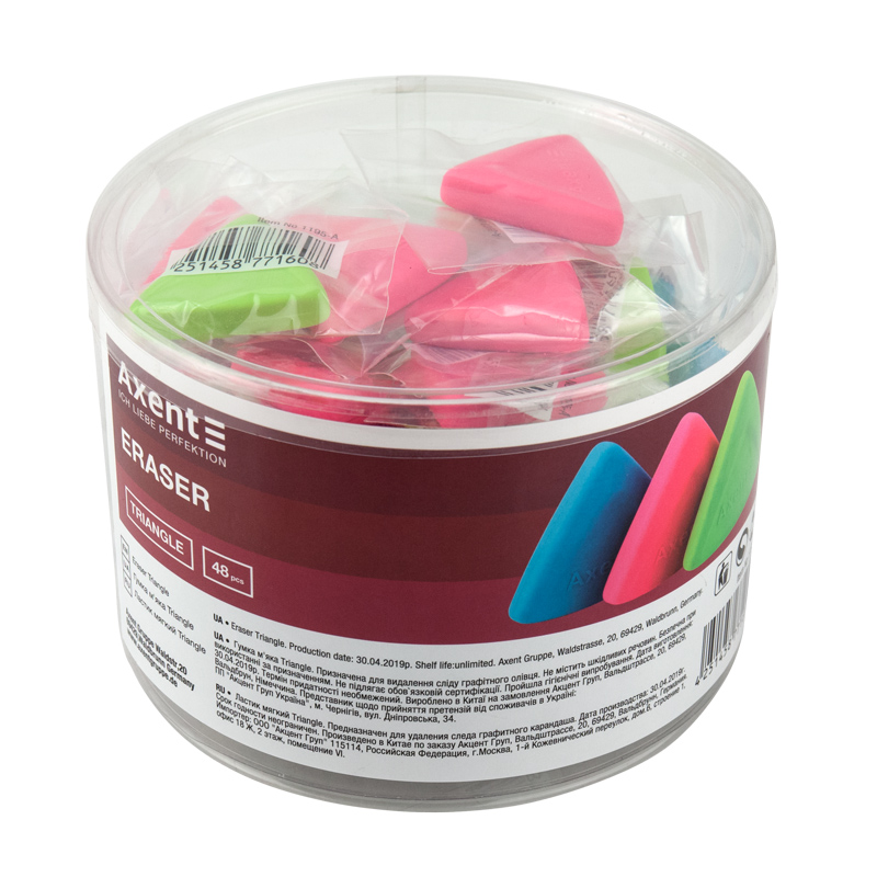 М'яка гумка Triangle Axent з якісного синтетичного каучуку, м'яко витирає лінії олівця без пошкодження паперу. Завдяки сучасному матеріалу пластична, не кришиться, максимально зручний у використанні. Має ергономічну форму, шість яскравих кольорів