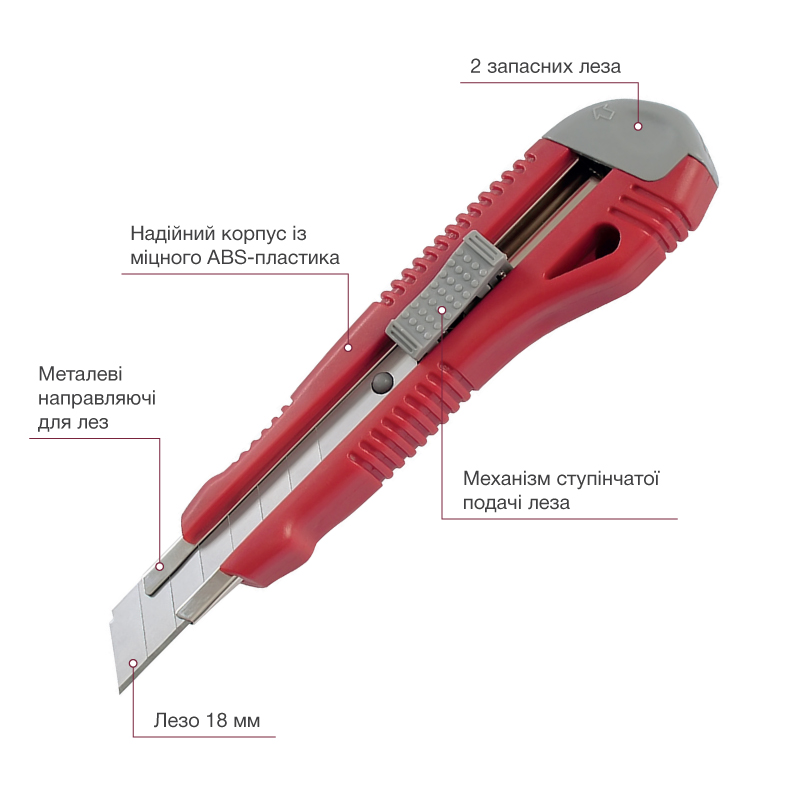 Ніж канцелярський 18 мм, металева направляюча +2 леза, корпус червоний, AXENT