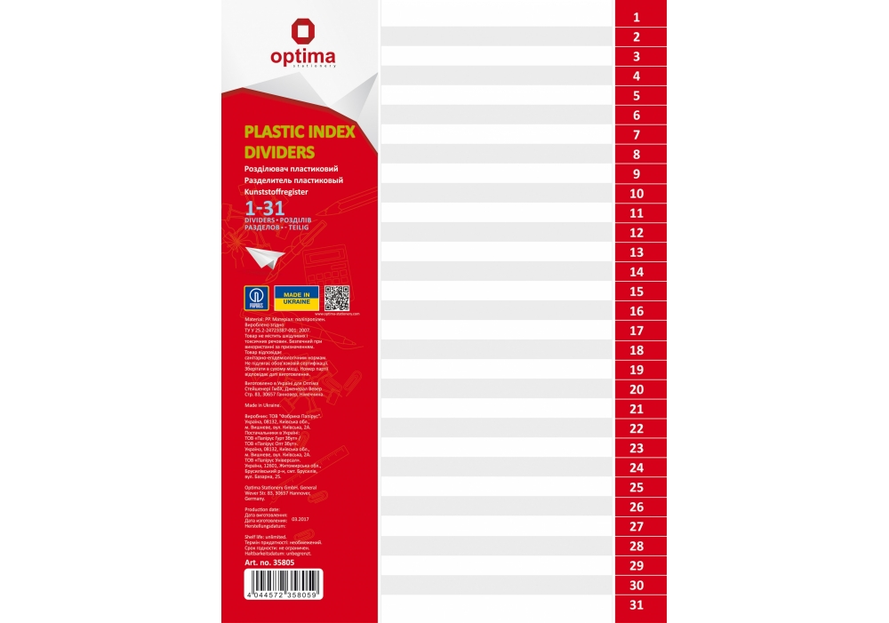 Розділювачі пластикові А4, цифрові 1-31, 31арк/пач, OPTIMA