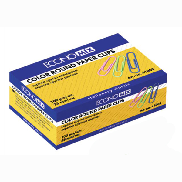 Скріпки канцелярські 28мм закруглені кольорові, картонна коробка 100шт., ECONOMIX